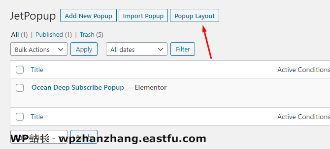 要开始,请转到JetPopup->所有弹出窗口然后单击在上面的弹出窗口布局按钮。